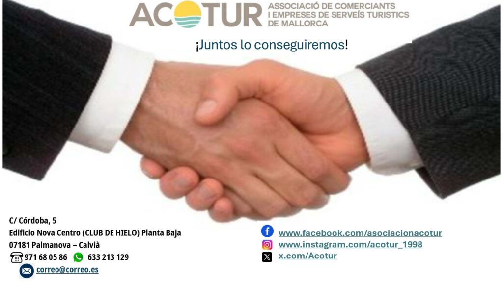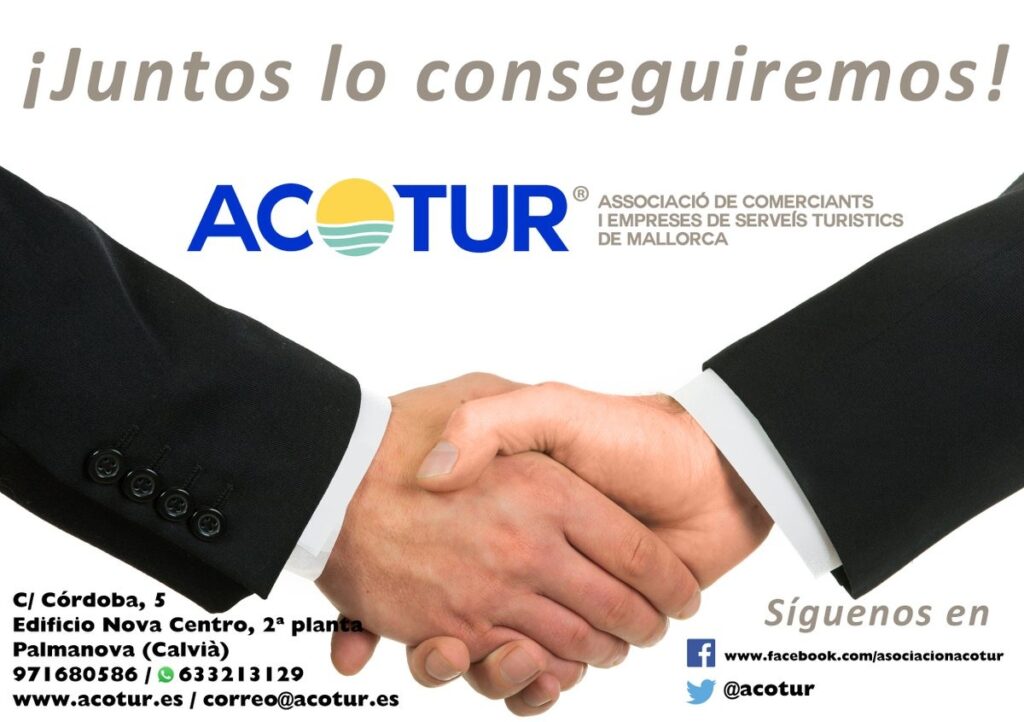 Desde ACOTUR una vez más seguimos trabajando e implicados en varios frentes ante las instituciones ayuntamientos govern balear como Consell insular y otros, con la experiencia de más de veinticinco años con vuestro apoyo y aportación, seguiremos presentes como mediadores ante las distintas administraciones. Seguimos estando en Edificio Nova Centro (Club de Hielo) Calle Córdoba